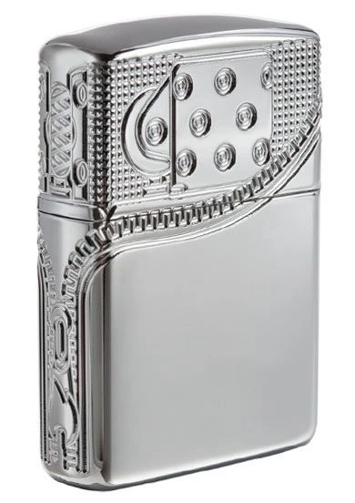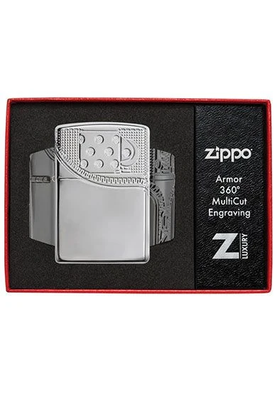 An Armor polished chrome Zippo lighter with a Zipped insert design which is deep carved around the body of the lighter using a multicut process. Comes in a Zippo presentation box.
