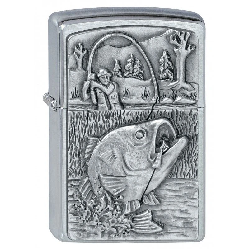 A brushed chrome Zippo lighter with a fishing theme. On the front is a Pewter emblem with a fisherman and Bass fish.