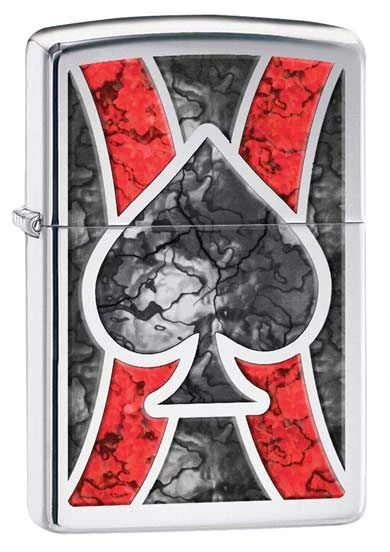 Polished chrome Zippo lighter with an Ace design in black and red. Printed using a Fusion process which uses translucent ink giving the appearance of stained glass.