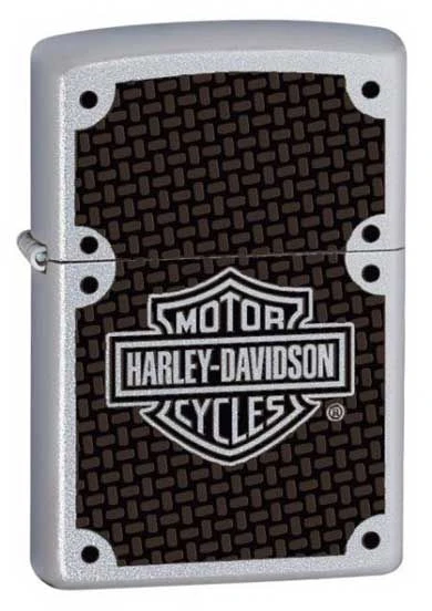 Satin chrome Zippo lighter with Harley Davidson Logo printed on a carbon effect background.