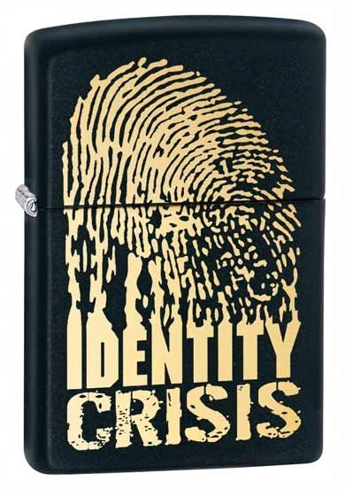 A matte black Zippo lighter with the image of a fingerprint and the words IDENTITY CRISIS printed on the front.