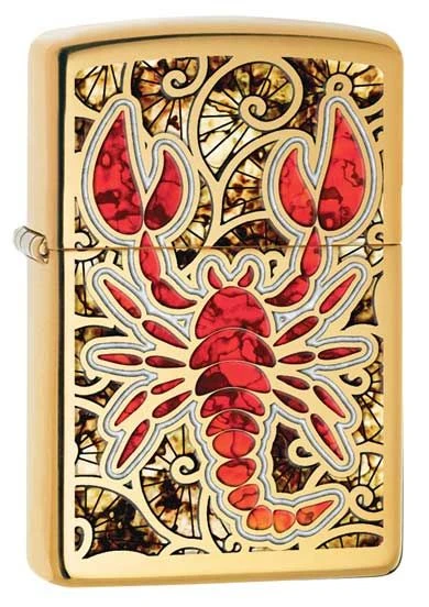 Polished brass Zippo lighter with a Scorpion Shell Design. Printed using a Fusion process which uses translucent ink giving the appearance of stained glass.
