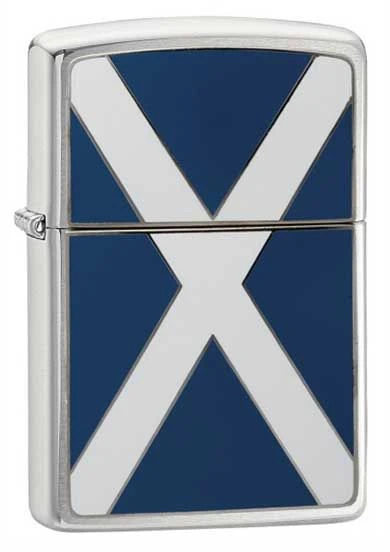 Brushed chrome Zippo lighter, featuring the Scottish flag.