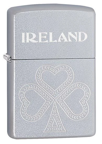A satin chrome Zippo lighter which has an Ireland themed Shamrock design laser engraved on the front.