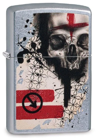A street chrome Zippo lighter with a Trash Polka tattoo skull design printed on the front. Trash Polka is a tattoo style originating from Germany.