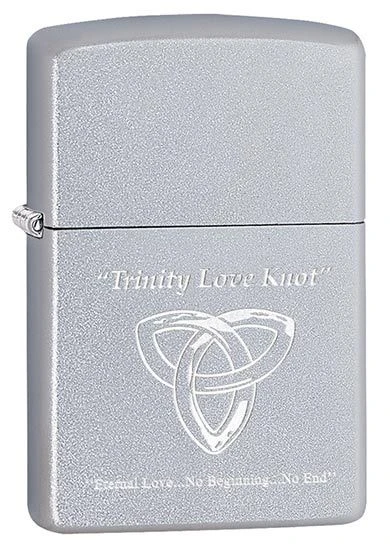 A satin chrome Zippo lighter which has a celtic themed trinity love knot design on the front. No beginning no end to eternal love..
