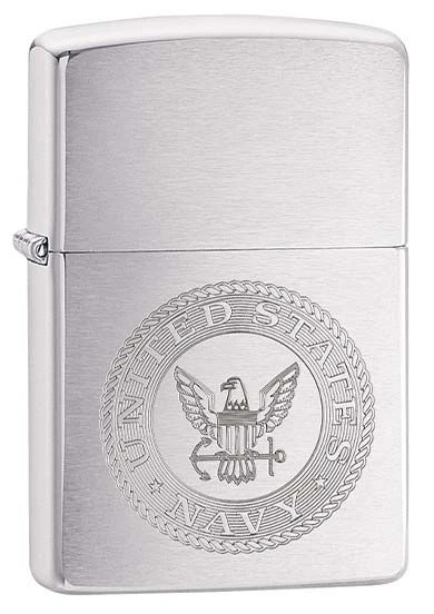 A brushed chrome US Navy Zippo lighter with the US Navy logo engraved on the front body of the Zippo.