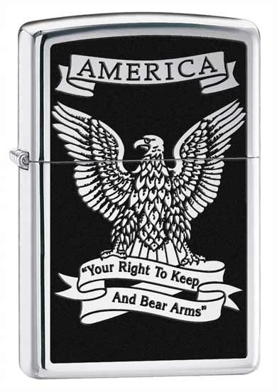 A polished chrome Zippo lighter with the image of an Eagle and America slogan in black.