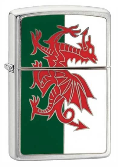 Brushed chrome Zippo lighter, with a welsh flag printed logo.