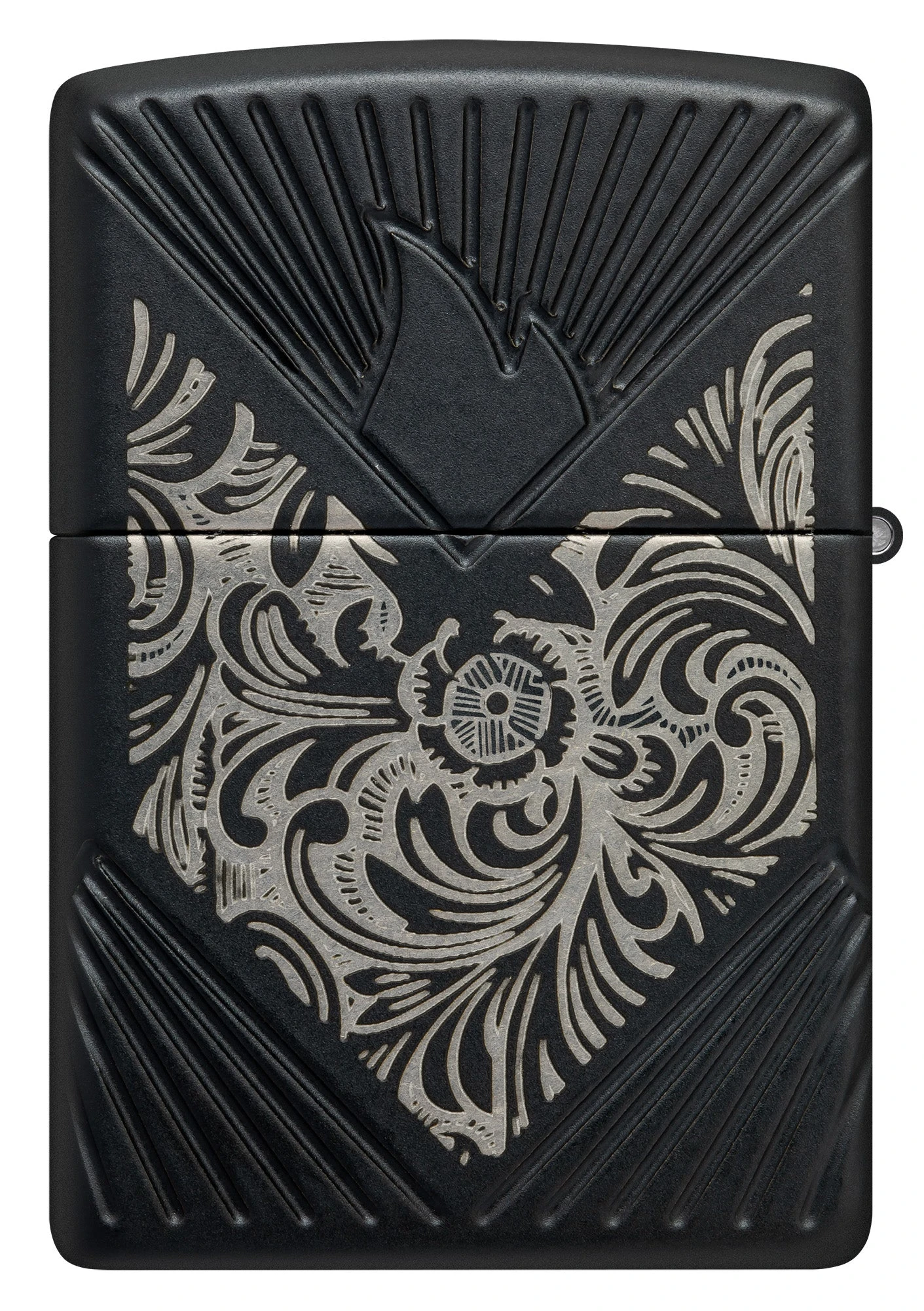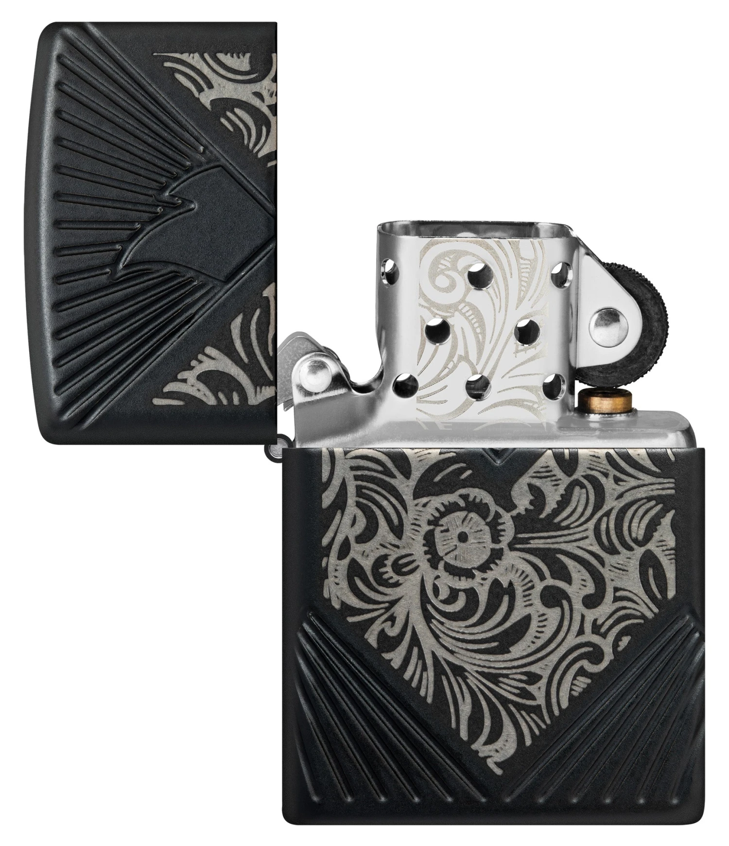 Introduced as the Florentine in 1974, the iconic Venetian® pattern swirls on all sides of the Armor® case with our Laser Engrave process. The ornate design contrasts beautifully with the Black Matte finish, which made its debut in 1984, while the Zippo icon is nestled among diagonal MultiCut pinstripes in an ode to the very first Deep Carve design unveiled in 2004. Finally, the Venetian pattern is replicated with delicate laser engraving on the chrome insert, which was chosen specially for Europe, the Middle East and Africa.