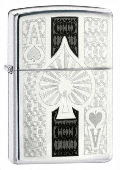 Polished chrome Zippo lighter with an intricate ace of spades etched design.
