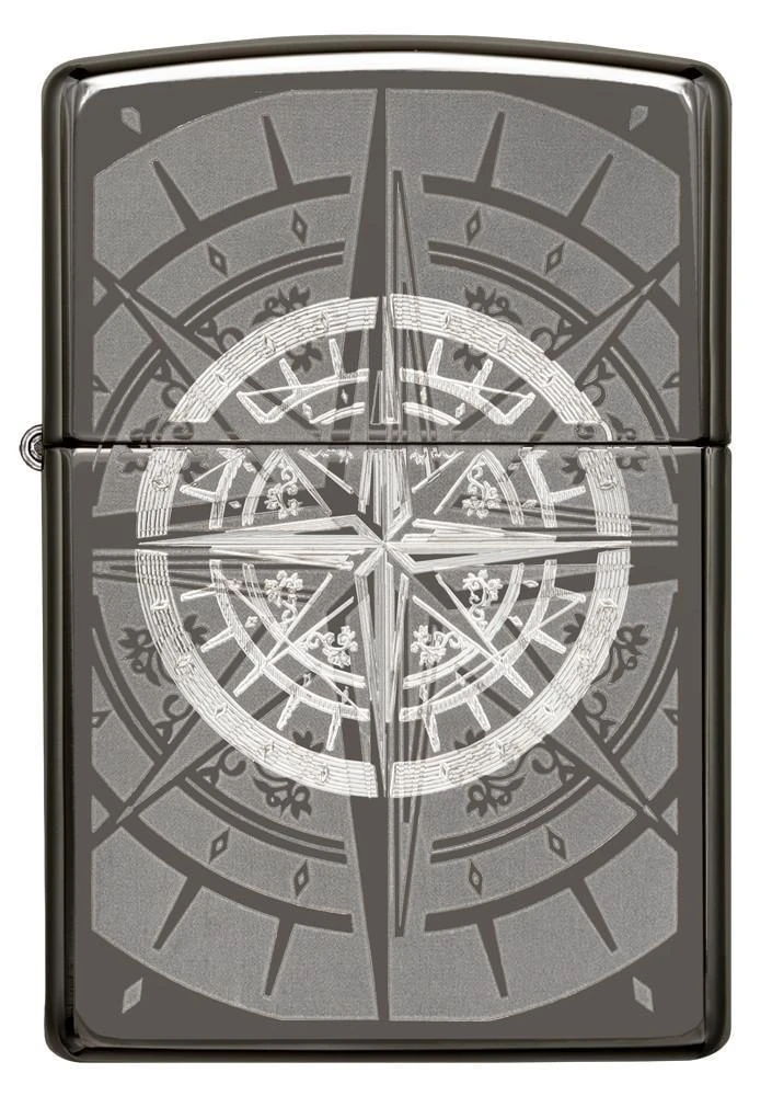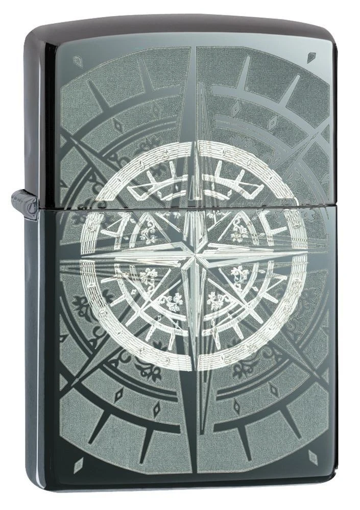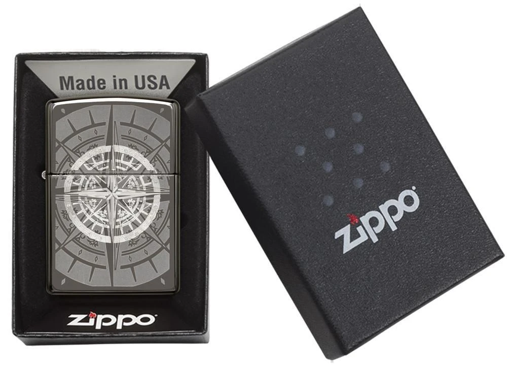 Bon Voyage! It’s the perfect lighter for any adventure, featuring an exquisite compass design with a Black Ice® finish. You’ll always be in the right place with this lighter. Comes packaged in a gift box. For optimal performance, fill with Zippo lighter fuel.