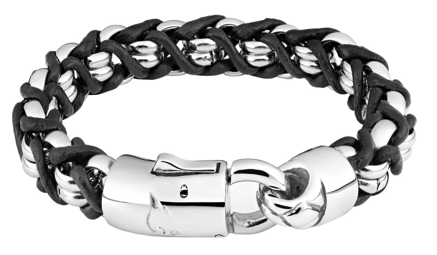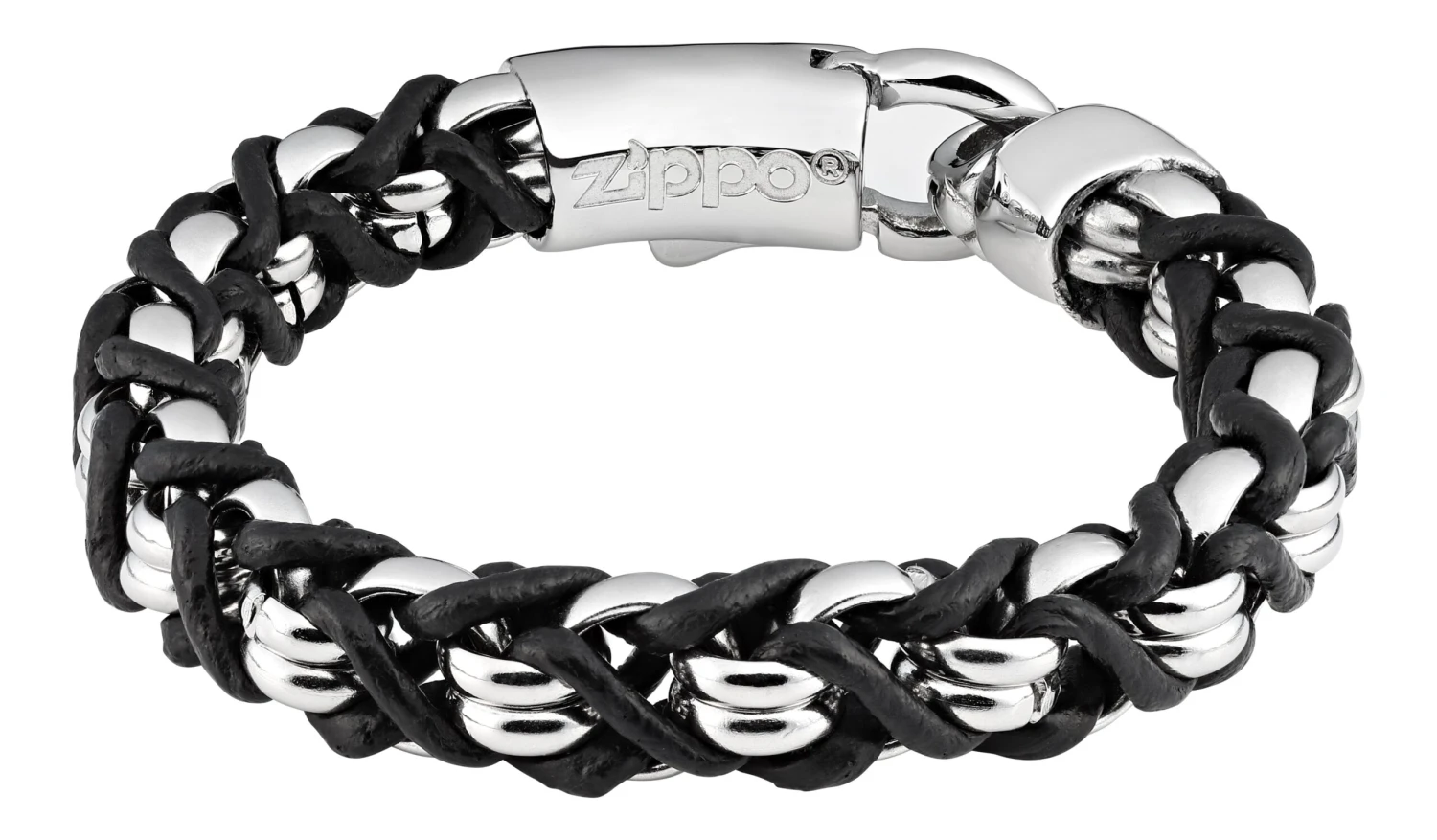 Stainless steel and leather bracelet with large links and leather braiding. Featuring a hook toggle clasp for a very secure hold around your wrist. The inside of the clasp is decorated with the original Zippo logo, with the outside featuring the Zippo flame.