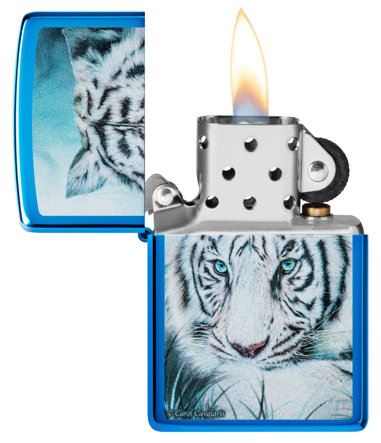 Digital and fine artist Carol Cavalaris celebrates the uniqueness of every living being with her extensive, mixed-media body of work, often blending reality and fantasy together in what she calls “living art.” Her piece, White Tiger – Spirit of Sensuality, comes to life in a vibrant Color Image design on this gleaming High Polish Blue lighter.