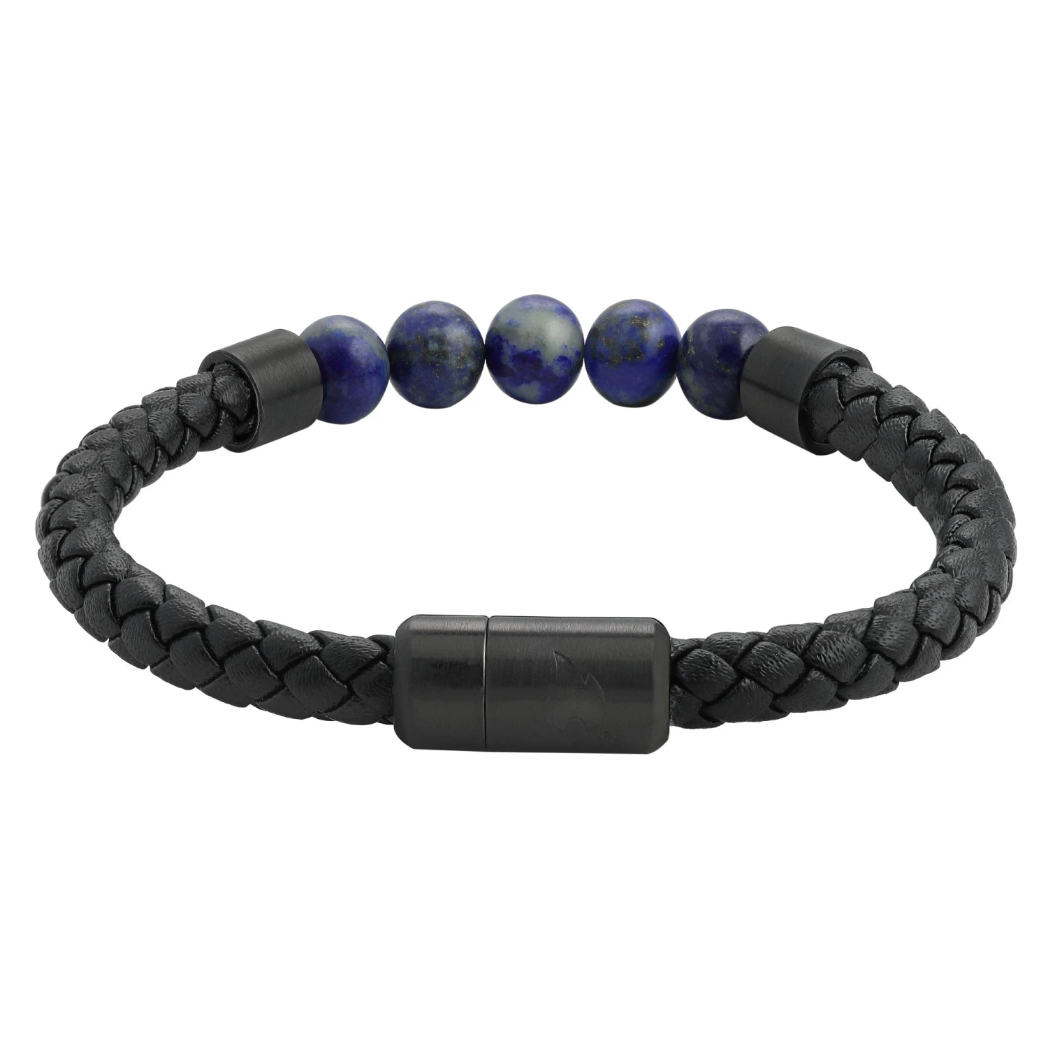 A thin leather bracelet with stainless steel and semi-precious stone elements. The centre of the bracelet is decorated by balls of semi-precious stones. The inside of the high polish clasp is decorated with the original Zippo logo.