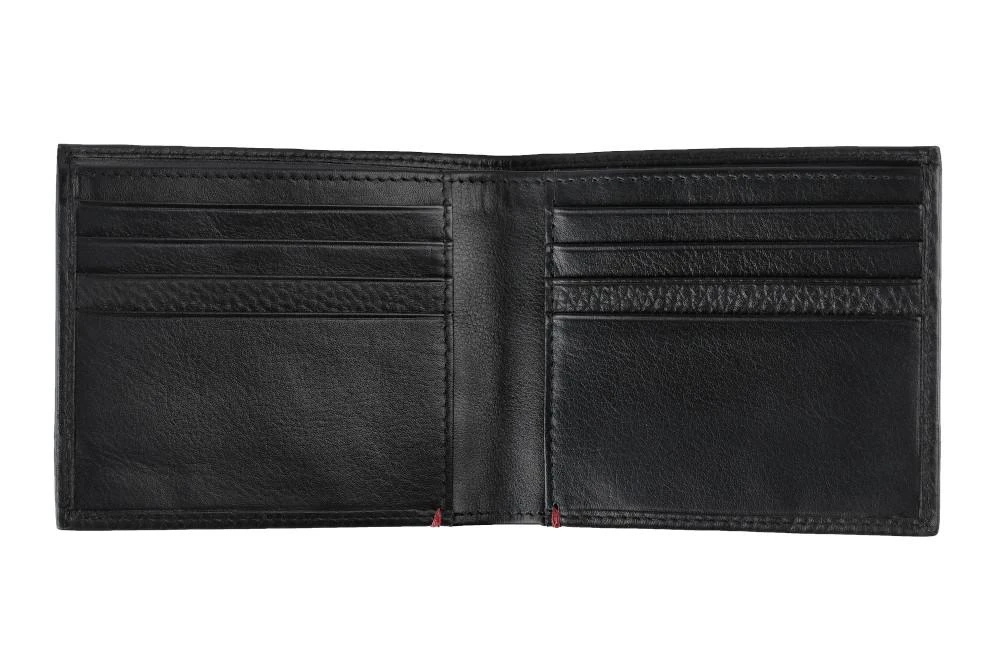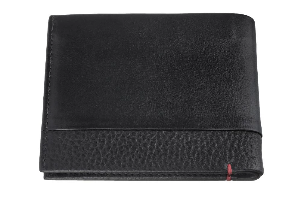 With our small wallet you can easily keep track of everything. Unobtrusive and functional in a matching black tone. Smooth leather and grained leather merge into a practical, stylish wallet.Â