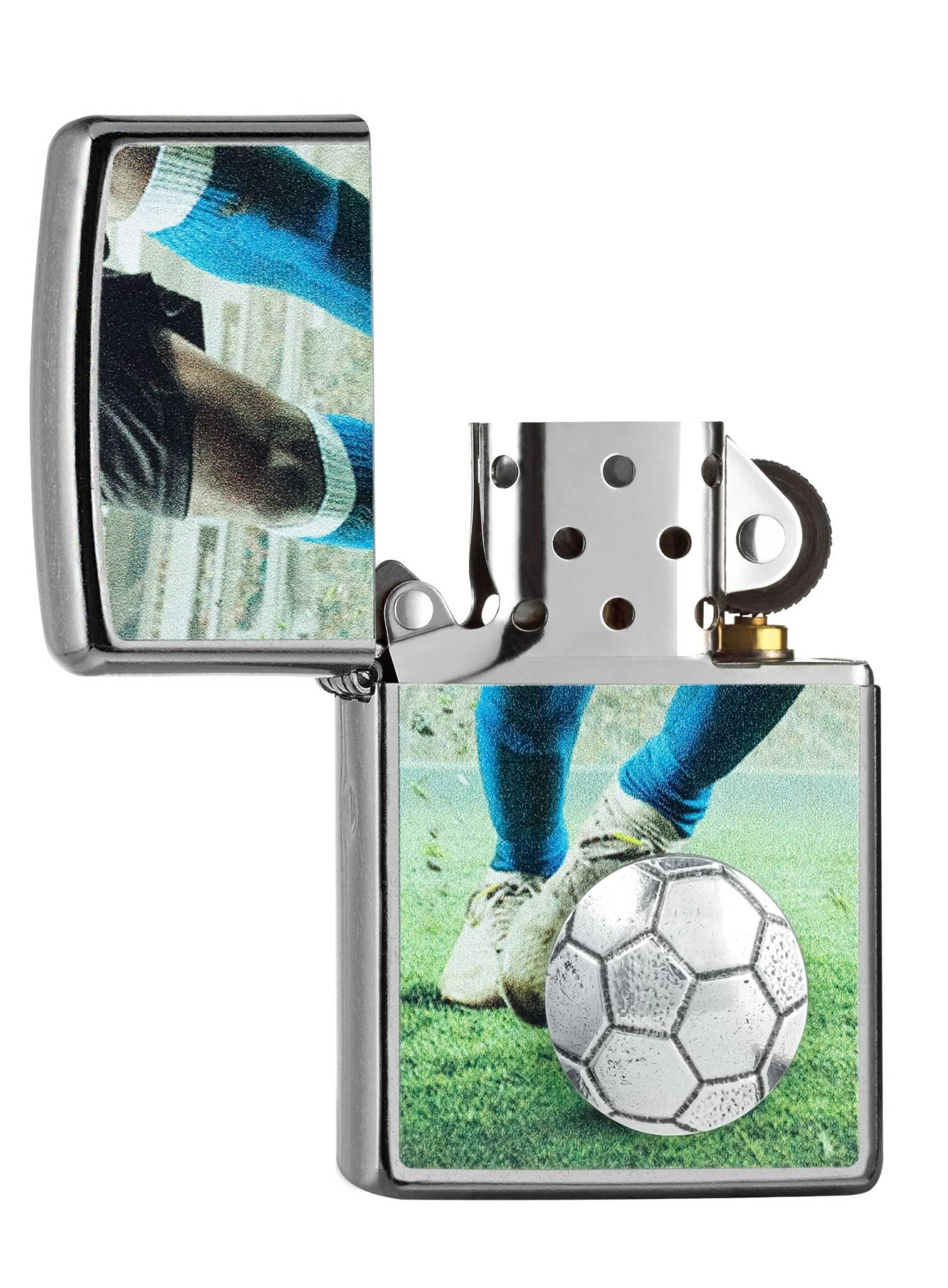 Perfect for any football fan, this classic Satin Chrome lighter features a vibrant Color Image design of a football player and is affixed with a metallic football emblem for a three-dimensional effect.