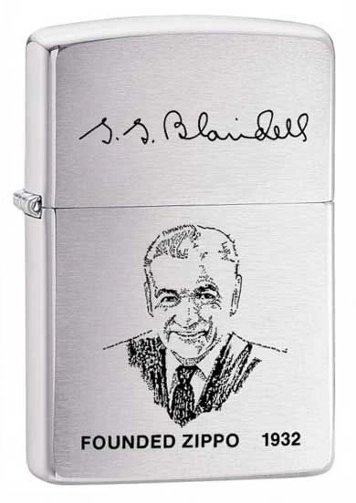 Brushed chrome Zippo lighter, featuring an image of the founder of Zippo, George G Blaisdell