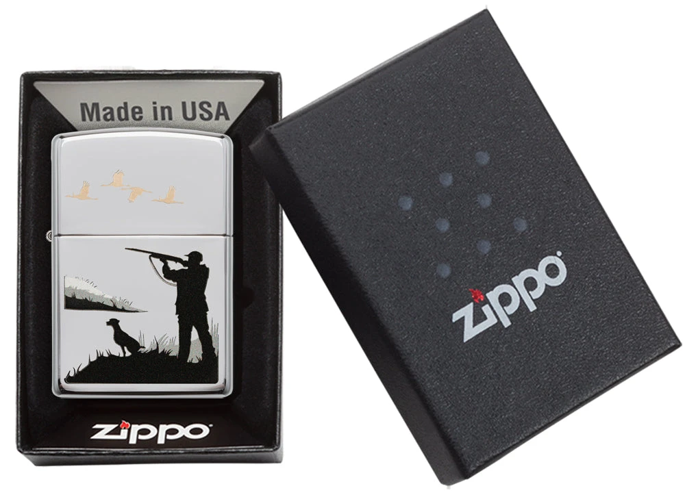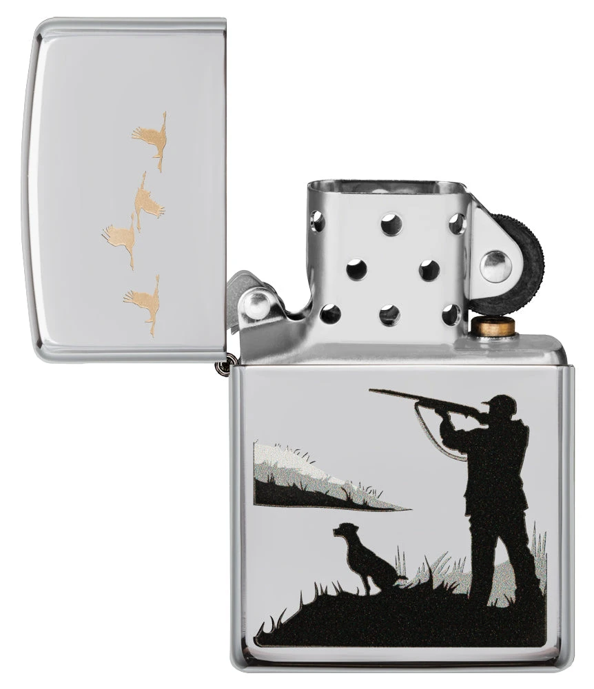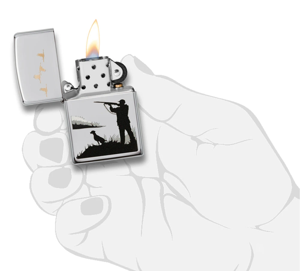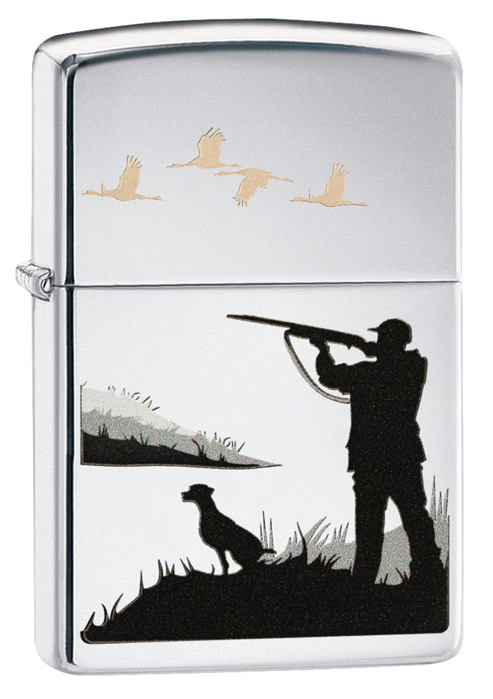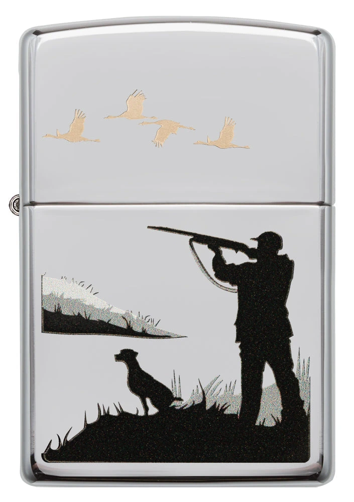 The nostalgic motif on this High Polish Chrome lighter, obtained using our Auto Two-Tone and Color Image processes, depicts a hunter, his dog and a flock of ducks.