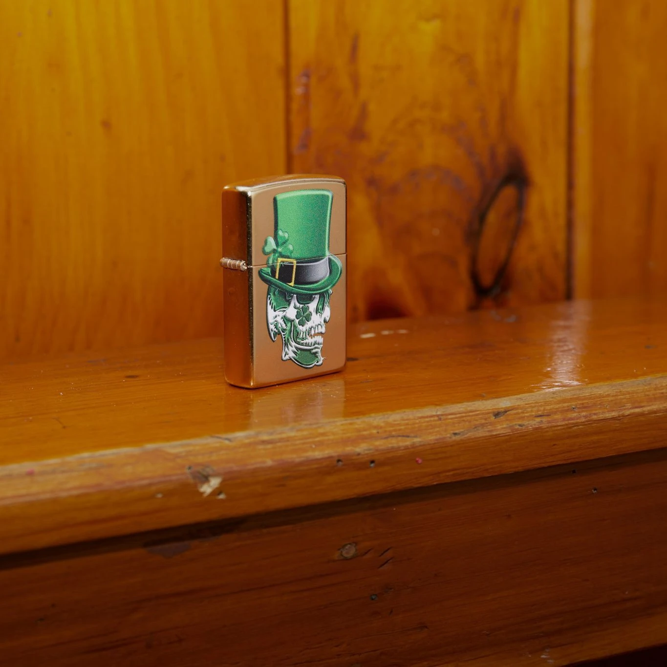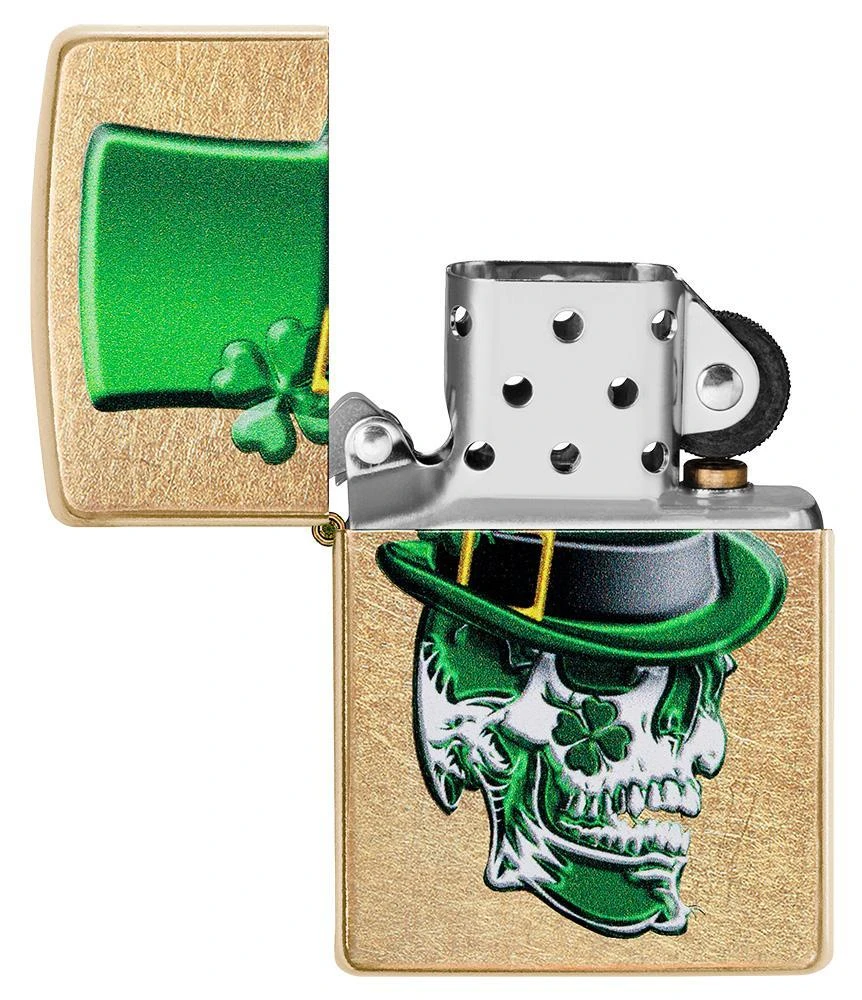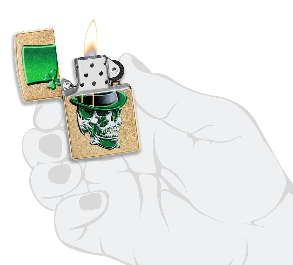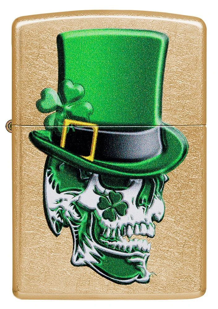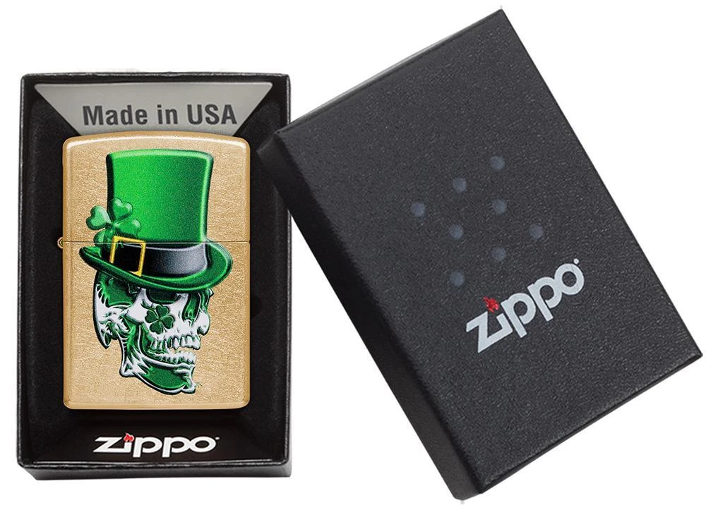 Look no further for the utmost fortunate yet frightful design. The Irish Skull design depicts a skull wearing a green St. Patrick’s day top hat with four-leaf clovers found throughout. This design is colour imaged on a Gold Dust lighter. Comes packaged in a gift box. For optimal performance, fill with Zippo lighter fuel.