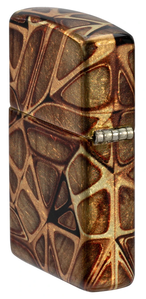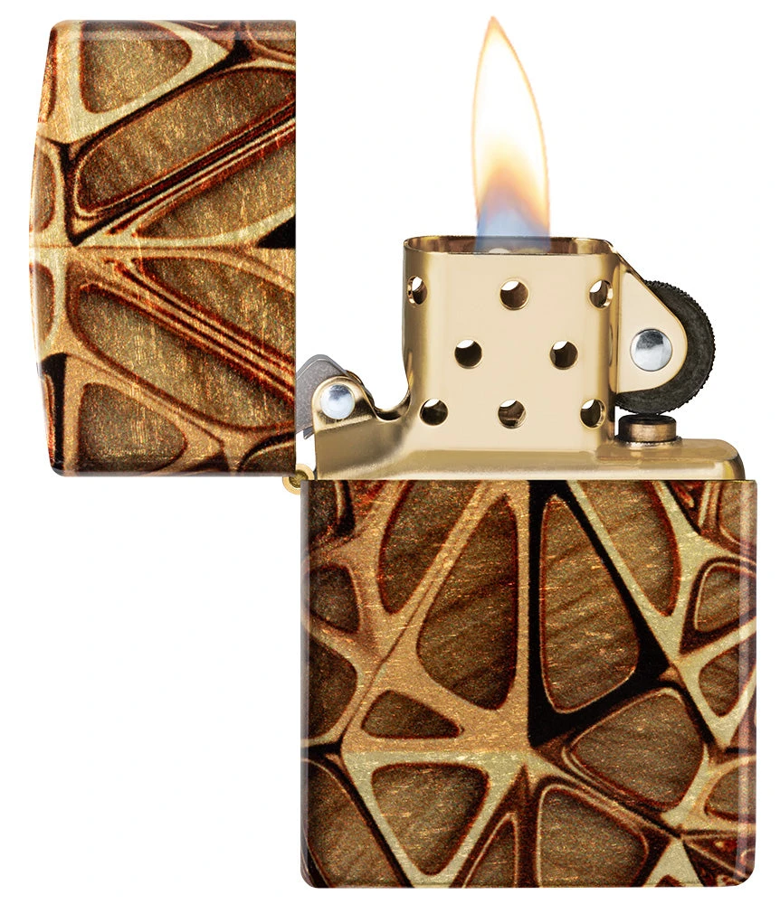 Realistic metallic webbing seems to surround this stunning 540 Fusion lighter. The all-over design is punctuated by the rich brass tones of the lighter’s case for added depth.Â