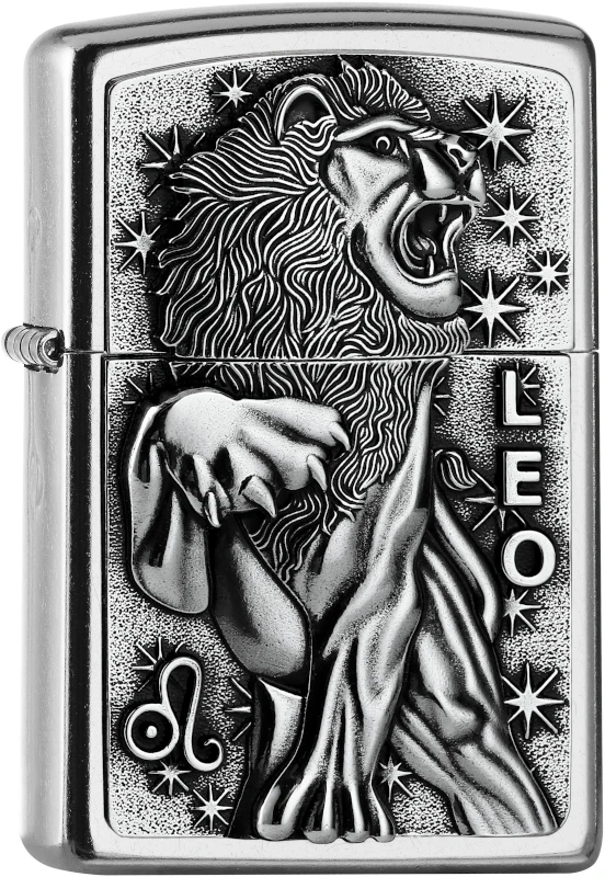 The Zodiac sign of Leo is one of the twelve signs of the Zodiac. A detailed star-lit Emblem design on a Street Chrome Windproof Zippo lighter. Comes packaged in a gift box. For optimal performance fill with Zippo lighter fuel.
