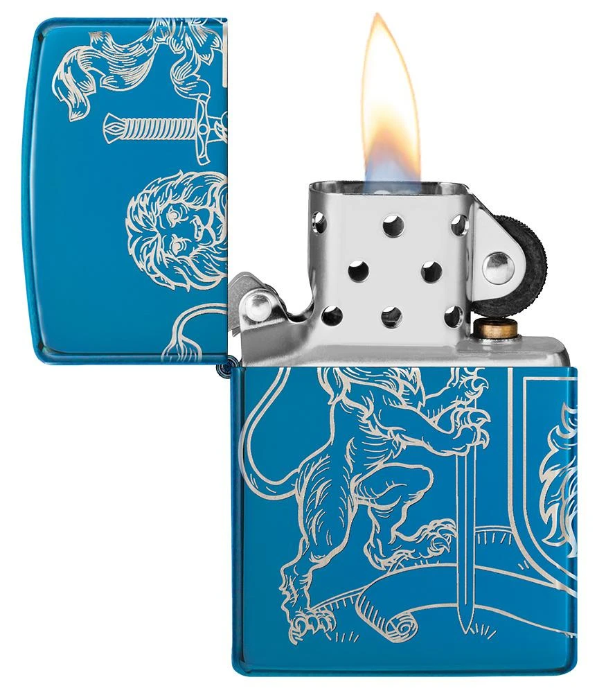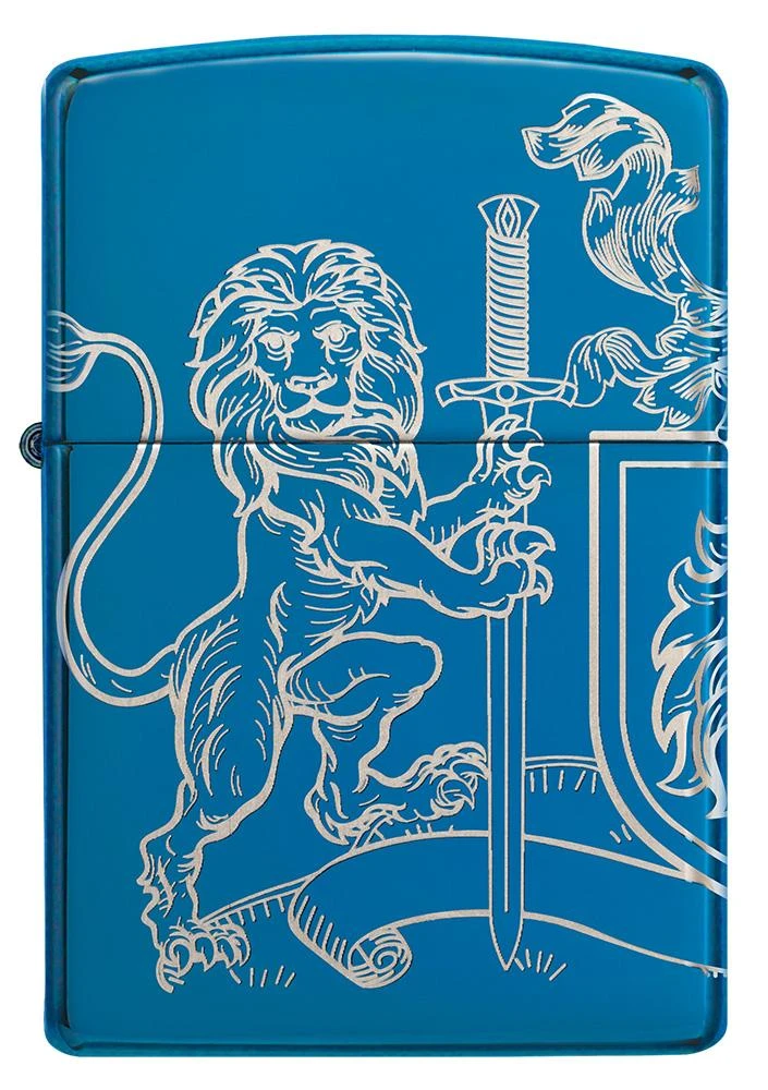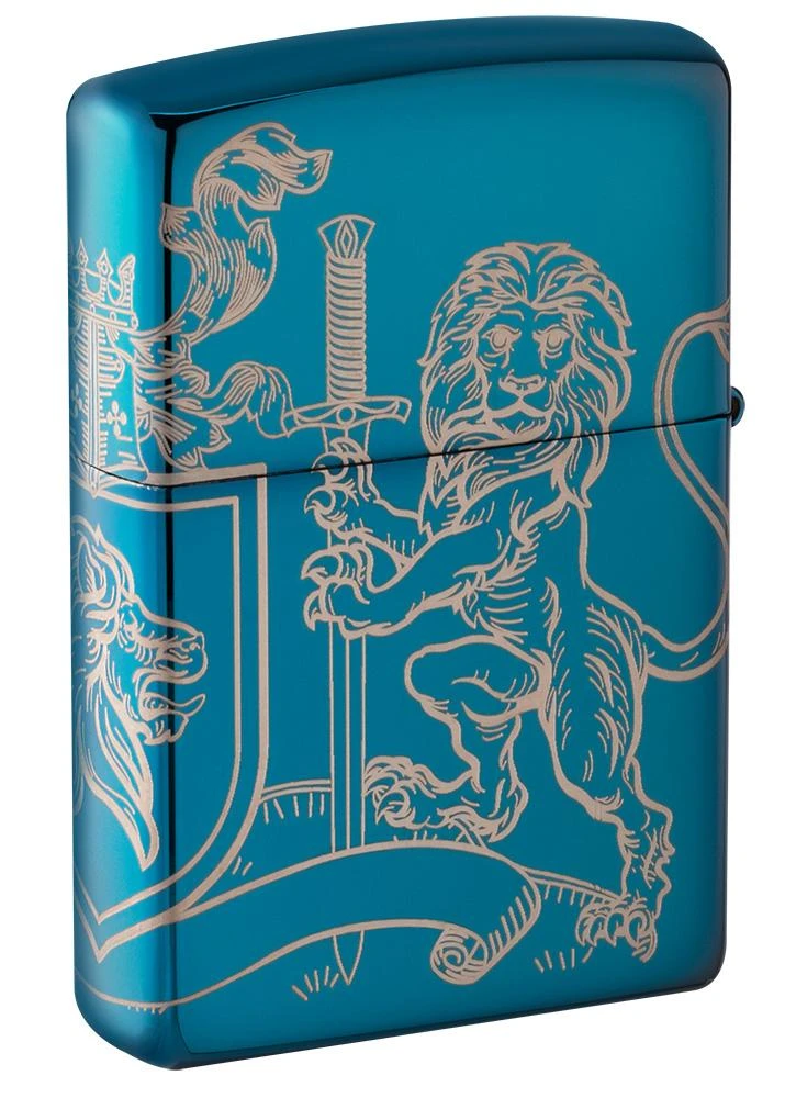 No symbols bring forth images of Knights in shining armour or ancient castles as much as the ones on this Medieval Coat of Arms lighter. A shield with lions, swords, and banners appear all around this High Polish Blue lighter. The Laser 360° process brings this medieval imagery to life. Comes packaged in a gift box. For optimal performance, fill with Zippo lighter fuel.