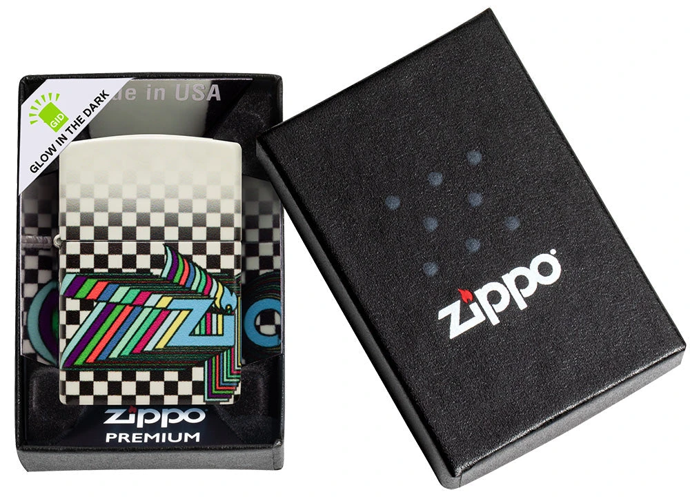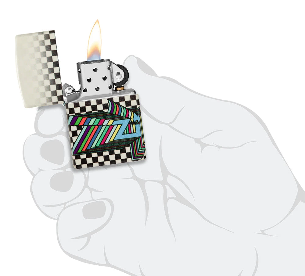 A multicolored Zippo logo radiates over a stark geometric background on this mesmerizing 540 Color lighter. The mesmerizing all-over design comes to life after dark thanks to our exclusive Glow-in-the-Dark finish.Â