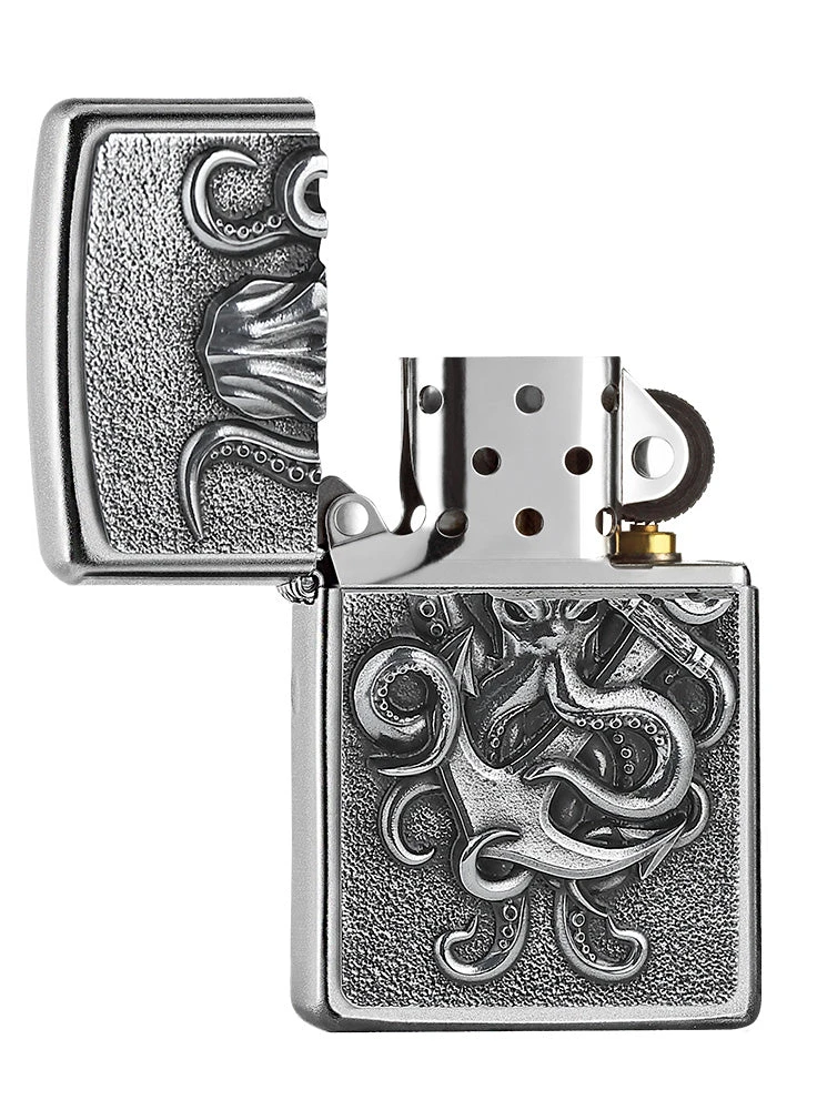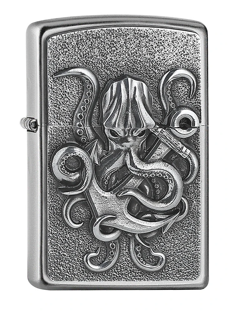 This classic Satin Chrome lighter features a detailed octopus, complete with swirling tentacles, on an intricate metallic emblem.Â