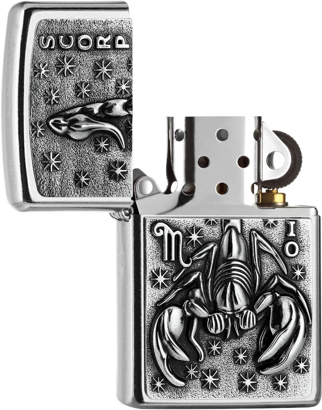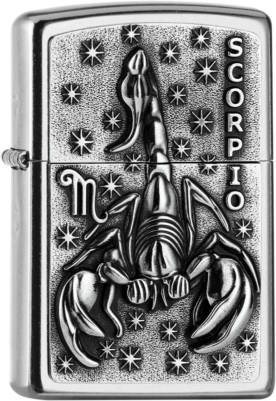The Zodiac sign of Scorpio is one of the twelve signs of the Zodiac. A detailed star-lit Emblem design on a Street Chrome Windproof Zippo lighter. Comes packaged in a gift box. For optimal performance fill with Zippo lighter fuel.