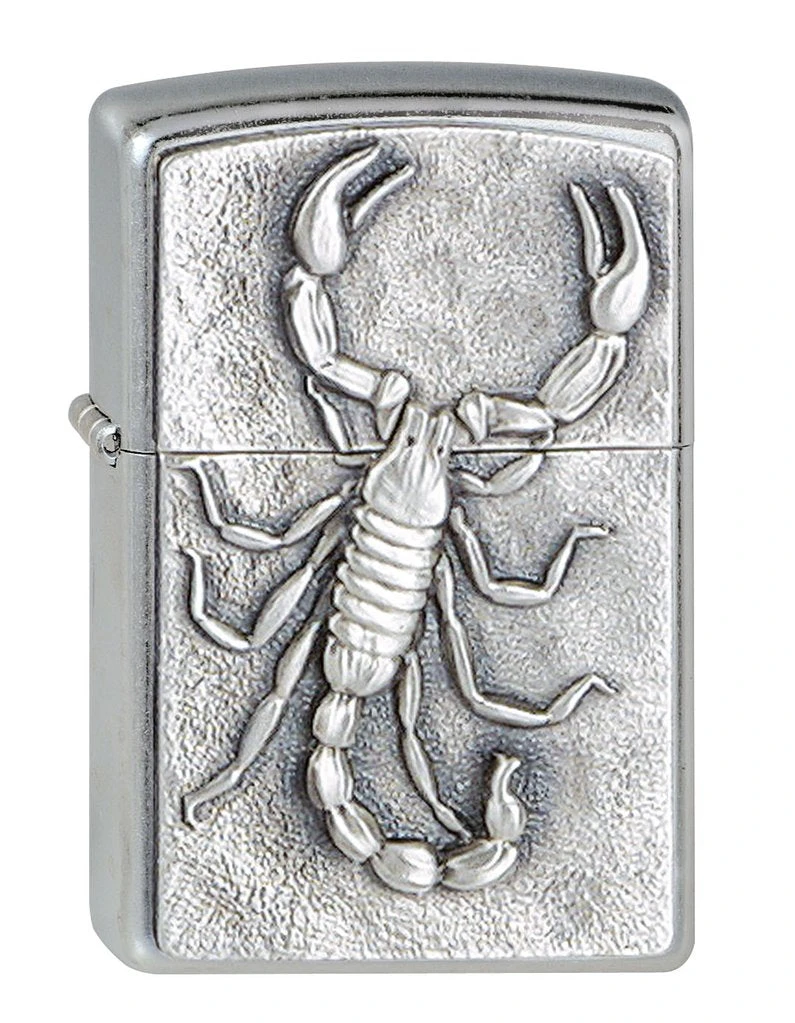 Watch the scorpion’s sting! Chrome Brushed emblem Zippo lighter. Comes packaged in a gift box. For optimal performance, fill with Zippo lighter fuel.