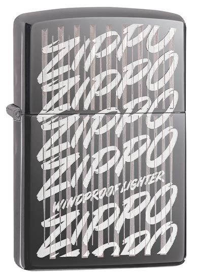 A black ice dark polished chrome Zippo lighter with a multiple vintage Zippo logo and lines design which is laser engraved on the front.