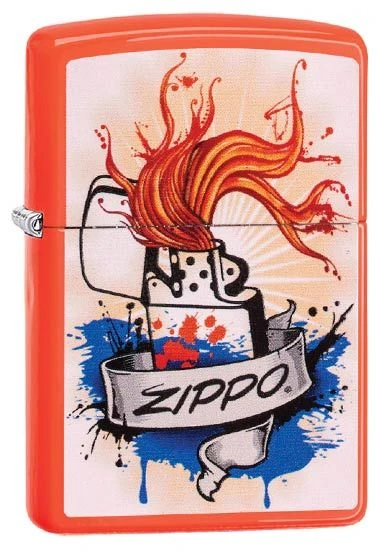 A neon orange Zippo lighter with an attractive Zippo lighter splash design printed on the front with the vintage Zippo logo.