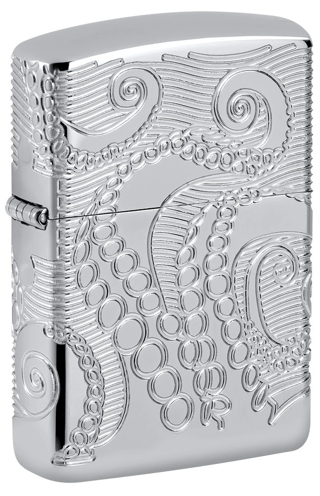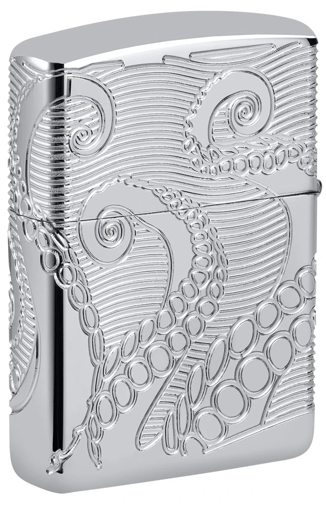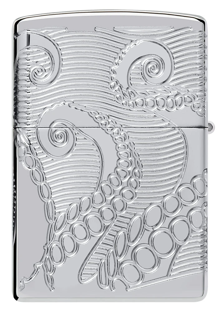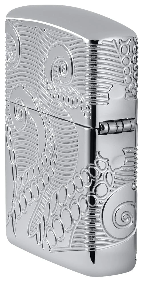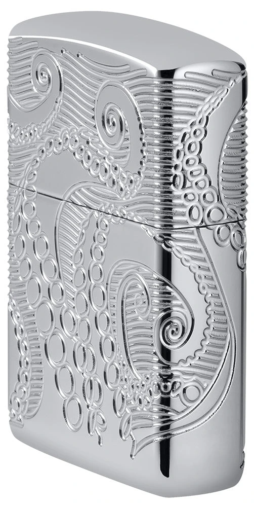 A monstrous sea creature wraps its tentacles completely around this Armor® High Polish Chrome lighter in an intricate MultiCut design.