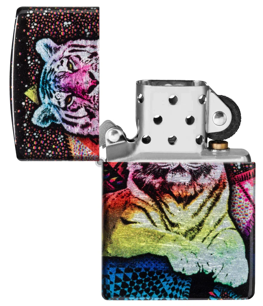 A regal tiger, depicted in vibrant, iridescent hues, poses on this beautiful 540 Fusion lighter. The motif is highlighted by the chrome tones of the lighter’s body, giving it an added dimension. This lighter comes in a gift box. For optimal performance, fill the lighter with Zippo fuel.