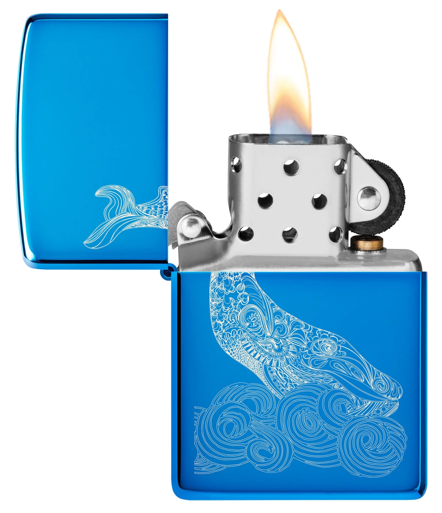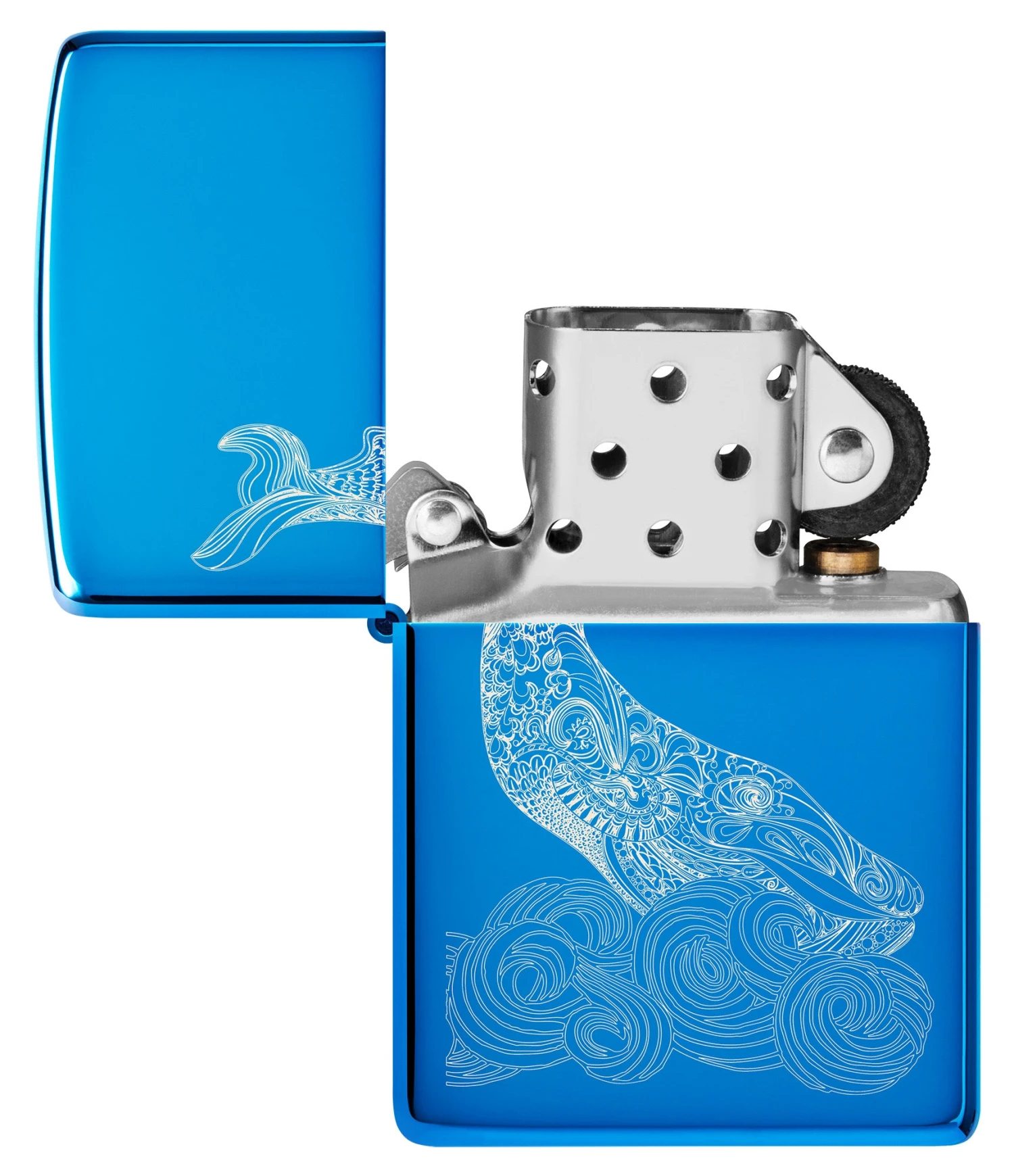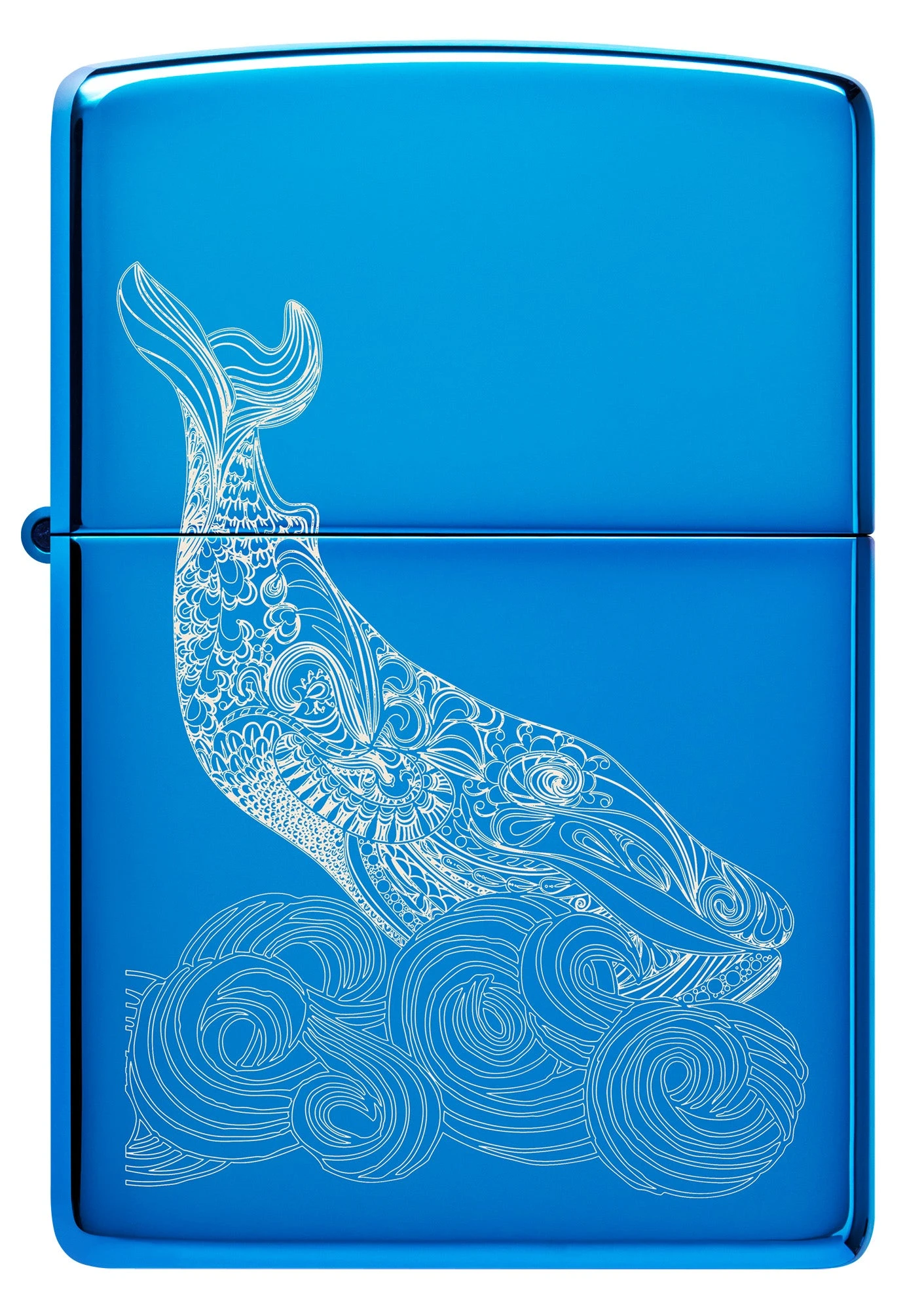 Thar she blows! The stunningly intricate design on this High Polish Blue lighter depicts the mighty whale commanding the ocean’s depths using our Laser Fancy Fill process.
